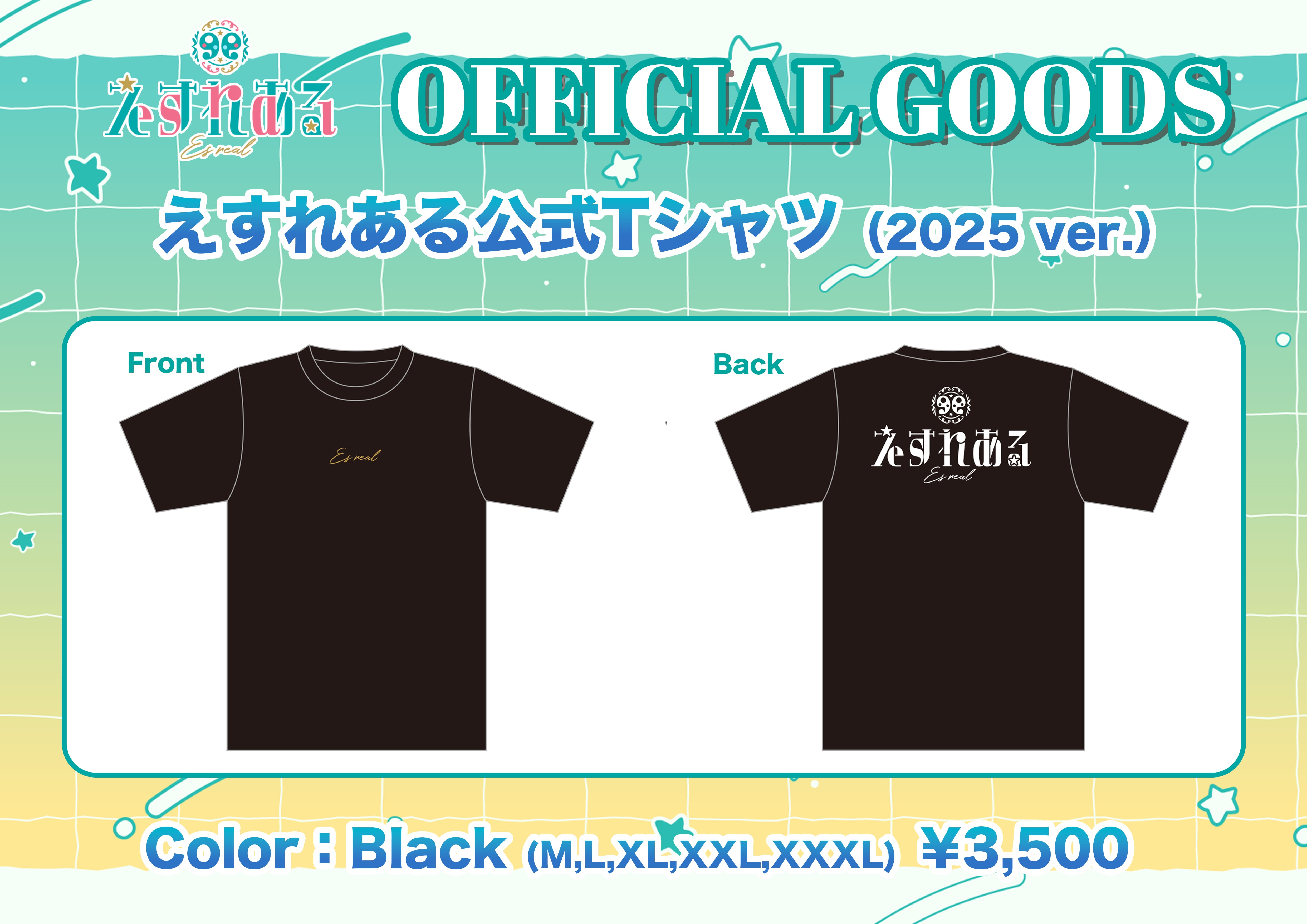 えすれある公式Tシャツ(2025ver.)がWALLOP IDOL MARKETの登場! ■メッセージサイン入りえすれある公式Tシャツ(2025ver.) サイズ:M/L/XL/XXL/XXXL カラー:ブラック(1色展開のみ) 価格:M〜XXXL ¥3,500