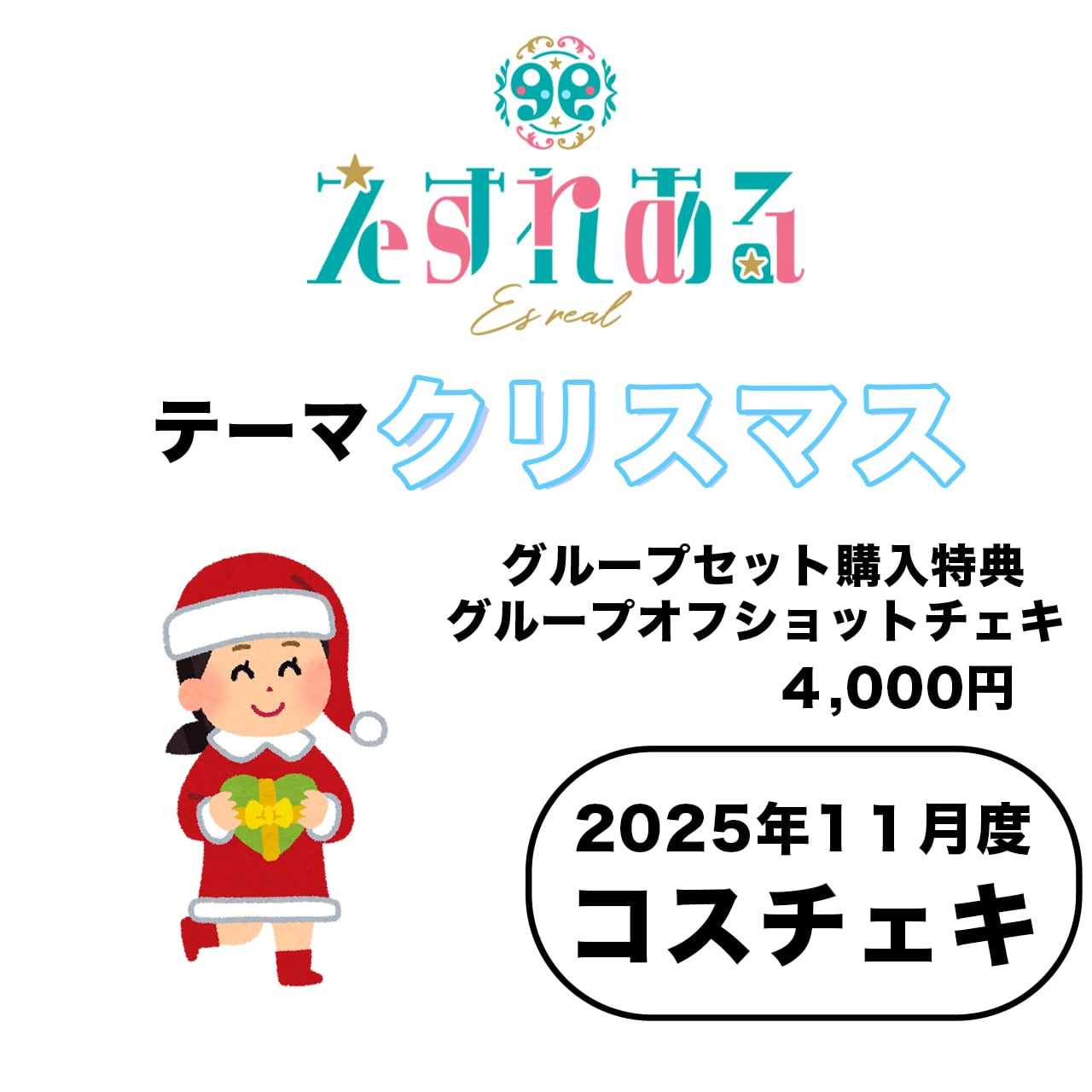 ※高本ことねのコスチェキは、発送が遅れる可能性がございます。あらかじめご了承ください。 ★★★★★★★★★注意!!★★★★★★★★★★ 【ニックネームについて】※推奨 事前に購入者情報入力画面にて、氏名の「姓」にフルネームを記入、「名」にニックネームを記入してご登録をお願い致します。 (例:姓「初音空美」名「そらみん」) こちらをご登録して頂いているお客様は、購入時に備考欄にニックネームの記載は必要ございません。 ▼ショッピングアプリBASEから修正する場合 PAY IDアカウント設定>PAY IDの編集より変更できます。 ※PAY IDにログインしていない場合は、ログイン後、編集いただけます。 ▼WEBから修正する場合 【PAY IDログインページ】へアクセス・ログイン後、メニューの「設定」ページより変更できます。 _________________________________________ 2025年11月のテーマはクリスマスになります! 限定受注販売となりますのでGETし忘れないようお気をつけください!!! ※配信はございません。 【販売商品】 11月 テーマ:クリスマス えすれある コスチェキ(宛名・一言メッセージ・サイン付き) グループセット(各メンバー1枚ずつ+グループオフショットチェキ) 4,000円 (送料別) ※単品の販売ページは別となりますので、ご注意ください。 ※グループオフショットチェキは衣装はテーマのものではございませんので、予めご了承ください。 ★★★★★★★★★注意!!★★★★★★★★★★ 購入者情報にニックネームの設定をしていない方は、 必ず備考欄にニックネームの記入をお願いします!!! 【販売期間】 2025年11月1日(土)21:00〜2025年11月7日(金)23:59 【ご注意事項】(必ずご確認頂き、ご納得の上ご購入下さい) ※注文確定毎に別途送料が発生します。複数の商品をご注文いただく場合は、買い物かごにまとめて注文の確定をお願いいたします。注文確定後に複数の注文を1つにまとめることはできませんので予めご了承ください。 ※サインは、購入時に記入いただいたニックネームを記入いたします。必ず購入者情報または備考欄にご記入をお願い致します。 ※メッセージ内容の指定はできません。 ※購入者情報または備考欄にニックネームのご記入がない場合はニックネームの記入はなしとさせていただきます。 ※ニックネームは、ご登録いただいた内容をそのまま使用させて頂きます。メンバー等に判断を委ねる内容はご遠慮ください。 ※ニックネームに長文または不適切な内容が含まれていた場合、スタッフの判断で割愛させて頂く場合がございます。 ※ニックネーム登録時に、絵文字、顔文字、半角文字・記号(!、&など)、特殊記号(ハートなど)、旧漢字等の機種依存文字が含まれている場合、文字化けや途中で切れてしてしまう場合がございます。 ニックネームに使用する文字に関しましては、お客様自身で機種依存文字かどうかを事前にご確認ください。文字化けによるサインの違いに関しましは、書き直し・撮り直しの対応はいたしかねますことをご了承ください。 ※ ひらがな・カタカナ以外のニックネームの方に関しましては、メンバーによる読み間違いが起こる場合がございます。ご不安な場合は、フリガナをご登録ください。 ※一度購入いただいた商品のキャンセルは致しかねます。ご注意ください。 ※商品自体に不備があった場合のみ、交換または返品の対応をさせて頂きます。サインの内容等の不備につきましては対応致しかねますので、あらかじめご了承の上ご購入下さい。 【配送時期】 11月23日(木)以降順次発送となります。 ※入金が確認できない注文につきましては、入金確認後の発送となります。 ※配送予定日より2週間以内にお送りいたします。お楽しみにお待ちください。 【決済方法】 BASEかんたん決済にてクレジットカード決済/キャリア決済のみ有効となります。