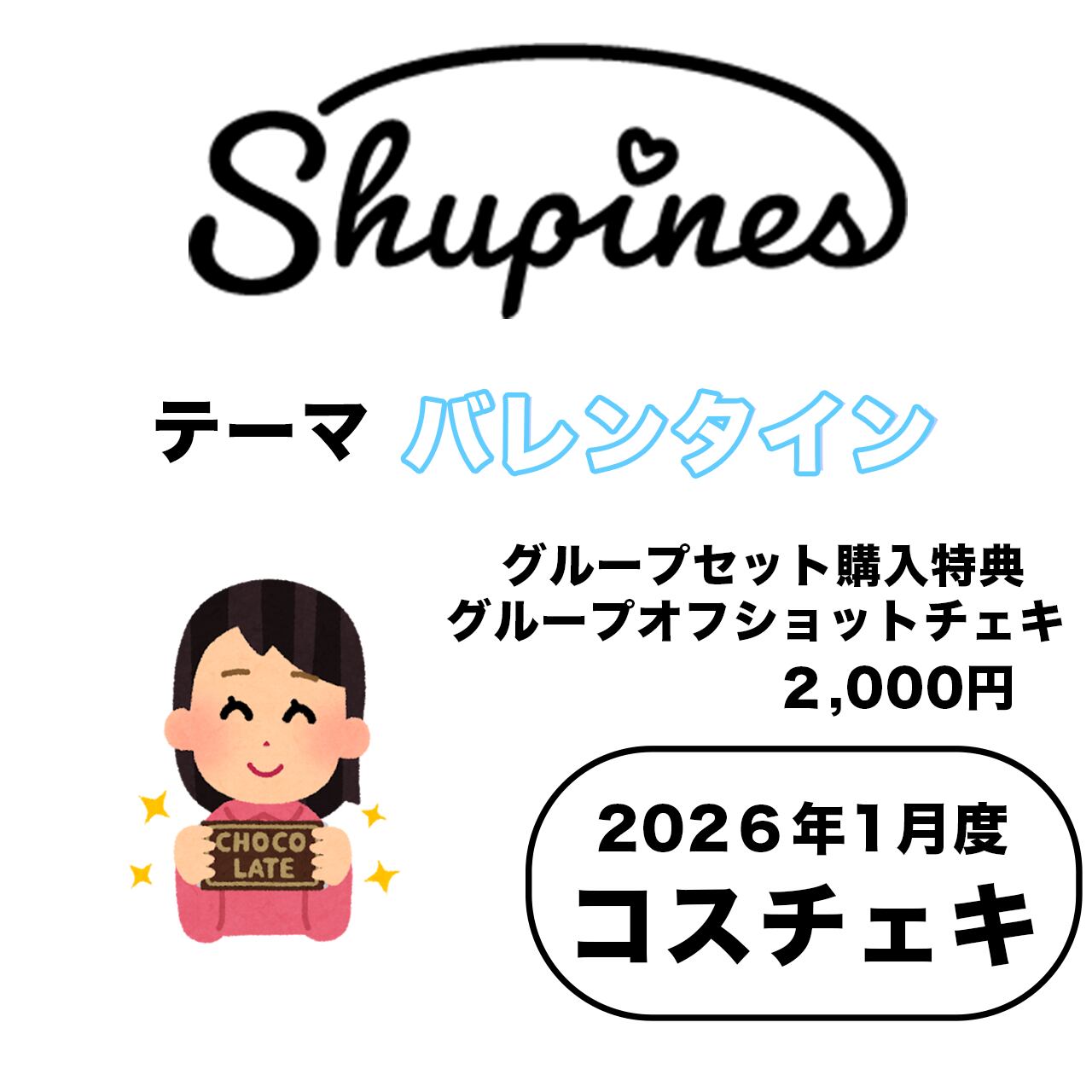 ★★★★★★★★★注意!!★★★★★★★★★★ 【ニックネームについて】※推奨 事前に購入者情報入力画面にて、氏名の「姓」にフルネームを記入、「名」にニックネームを記入してご登録をお願い致します。 (例:姓「横音ひな」名「よこひな」) こちらをご登録して頂いているお客様は、購入時に備考欄にニックネームの記載は必要ございません。 ▼ショッピングアプリBASEから修正する場合 PAY IDアカウント設定>PAY IDの編集より変更できます。 ※PAY IDにログインしていない場合は、ログイン後、編集いただけます。 ▼WEBから修正する場合 【PAY IDログインページ】へアクセス・ログイン後、メニューの「設定」ページより変更できます。 _________________________________________ 2026年1月のテーマはバレンタインになります! 限定受注販売となりますのでGETし忘れないようお気をつけください!!! ※配信はございません。 【販売商品】 Shupines コスチェキ(宛名・一言メッセージ・サイン付き) グループセット(各メンバー1枚ずつ+グループオフショットチェキ) 2,000円 (送料別) ※単品の販売ページは別となりますので、ご注意ください。 ※グループオフショットチェキは衣装はテーマのものではございませんので、予めご了承ください。 ★★★★★★★★★注意!!★★★★★★★★★★ 購入者情報にニックネームの設定をしていない方は、 必ず備考欄にニックネームの記入をお願いします!!! 【販売期間】 2026年1月1日(木)21:00〜2026年1月7日(水)23:59 【ご注意事項】(必ずご確認頂き、ご納得の上ご購入下さい) ※注文確定毎に別途送料が発生します。複数の商品をご注文いただく場合は、買い物かごにまとめて注文の確定をお願いいたします。注文確定後に複数の注文を1つにまとめることはできませんので予めご了承ください。 ※サインは、購入時に記入いただいたニックネームを記入いたします。必ず購入者情報または備考欄にご記入をお願い致します。 ※メッセージ内容の指定はできません。 ※購入者情報または備考欄にニックネームのご記入がない場合はニックネームの記入はなしとさせていただきます。 ※ニックネームは、ご登録いただいた内容をそのまま使用させて頂きます。メンバー等に判断を委ねる内容はご遠慮ください。 ※ニックネームに長文または不適切な内容が含まれていた場合、スタッフの判断で割愛させて頂く場合がございます。 ※ニックネーム登録時に、絵文字、顔文字、半角文字・記号(!、&など)、特殊記号(ハートなど)、旧漢字等の機種依存文字が含まれている場合、文字化けや途中で切れてしてしまう場合がございます。 ニックネームに使用する文字に関しましては、お客様自身で機種依存文字かどうかを事前にご確認ください。文字化けによるサインの違いに関しましは、書き直し・撮り直しの対応はいたしかねますことをご了承ください。 ※ ひらがな・カタカナ以外のニックネームの方に関しましては、メンバーによる読み間違いが起こる場合がございます。ご不安な場合は、フリガナをご登録ください。 ※一度購入いただいた商品のキャンセルは致しかねます。ご注意ください。 ※商品自体に不備があった場合のみ、交換または返品の対応をさせて頂きます。サインの内容等の不備につきましては対応致しかねますので、あらかじめご了承の上ご購入下さい。 【配送時期】 1月25日(日)以降順次発送となります。 ※入金が確認できない注文につきましては、入金確認後の発送となります。 ※配送予定日より2週間以内にお送りいたします。お楽しみにお待ちください。