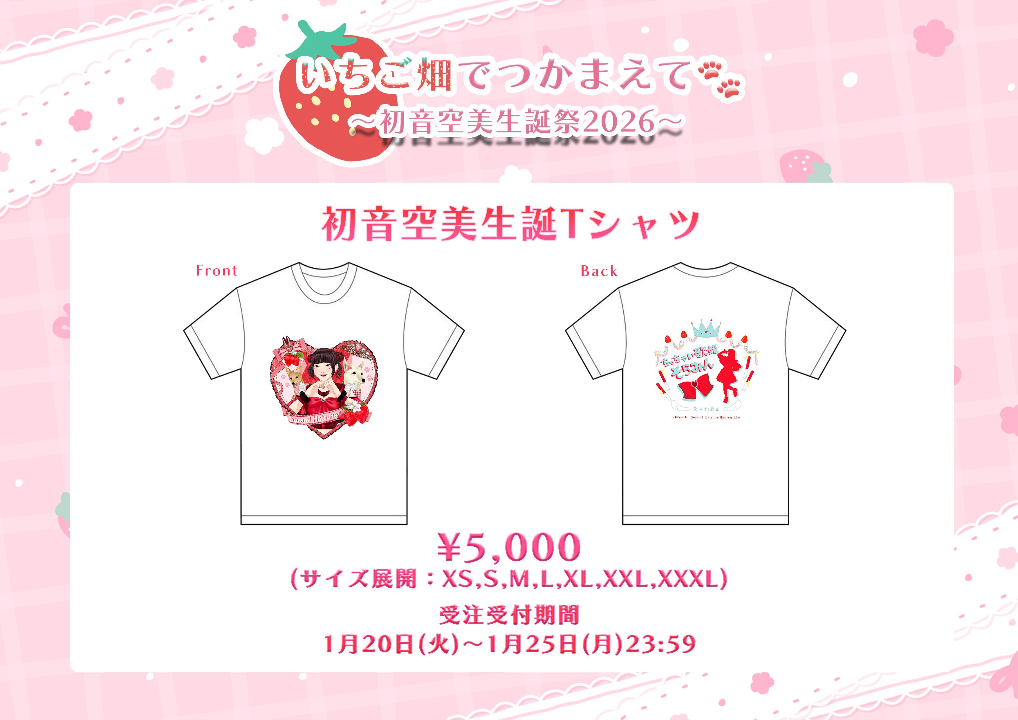 ■初音空美生誕Tシャツ 2026 ボディカラー:ホワイト サイズ:S・M・L・XL・XXL・XXXL 価格:¥5,000 こちらのTシャツは受注販売商品となります! (※2/8(日)の『いちご畑でつかまえて ~初音空美生誕祭2026~』にて販売予定はございますが、少量のみの生産のため、売り切れ次第終了となります、ぜひ事前の受注購入をお勧めいたします。) ※郵送用のページとなっております。※ 【ご注意事項】(必ずご確認頂き、ご納得の上ご購入下さい) ※注文確定毎に別途送料が発生します。複数の商品をご注文いただく場合は、買い物かごにまとめて注文の確定をお願いいたします。注文確定後に複数の注文を1つにまとめることはできませんので予めご了承ください。 ※複数のご注文をいただいた場合、商品をまとめて発送をさせていただく場合がございます。 ※数量限定につき無くなり次第終了とさせていただきます。 ※チェキ券などの特典券は付きません。 ※購入後のキャンセルは不可となります。