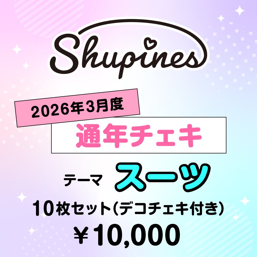 ★★★★★★★★★注意!!★★★★★★★★★★ 【ニックネームについて】※推奨 事前に購入者情報入力画面にて、氏名の「姓」にフルネームを記入、「名」にニックネームを記入してご登録をお願い致します。 (例:姓「百瀬朱莉」名「もあちゃん」) こちらをご登録して頂いているお客様は、購入時に備考欄にニックネームの記載は必要ございません。 ▼ショッピングアプリBASEから修正する場合 PAY IDアカウント設定>PAY IDの編集より変更できます。 ※PAY IDにログインしていない場合は、ログイン後、編集いただけます。 ▼WEBから修正する場合 【PAY IDログインページ】へアクセス・ログイン後、メニューの「設定」ページより変更できます。 _________________________________________ 2026年3月のテーマはスーツになります! 限定受注販売となりますのでGETし忘れないようお気をつけください!!! ※配信はございません。 【販売商品】 3月 テーマ:スーツ Shupines コスチェキ(宛名・一言メッセージ・サイン付き) 各メンバー別 10枚セット 10,000円 (送料別) ※単品の販売ページは別となりますので、ご注意ください。 ★★★★★★★★★注意!!★★★★★★★★★★ 購入者情報にニックネームの設定をしていない方は、 必ず備考欄にニックネームの記入をお願いします!!! 【販売期間】 2026年3月1日(日)21:00〜2026年3月7日(土)23:59 【ご注意事項】(必ずご確認頂き、ご納得の上ご購入下さい) ※注文確定毎に別途送料が発生します。複数の商品をご注文いただく場合は、買い物かごにまとめて注文の確定をお願いいたします。注文確定後に複数の注文を1つにまとめることはできませんので予めご了承ください。 ※サインは、購入時に記入いただいたニックネームを記入いたします。必ず購入者情報または備考欄にご記入をお願い致します。 ※メッセージ内容の指定はできません。 ※購入者情報または備考欄にニックネームのご記入がない場合はニックネームの記入はなしとさせていただきます。 ※ニックネームは、ご登録いただいた内容をそのまま使用させて頂きます。メンバー等に判断を委ねる内容はご遠慮ください。 ※ニックネームに長文または不適切な内容が含まれていた場合、スタッフの判断で割愛させて頂く場合がございます。 ※ニックネーム登録時に、絵文字、顔文字、半角文字・記号(!、&など)、特殊記号(ハートなど)、旧漢字等の機種依存文字が含まれている場合、文字化けや途中で切れてしてしまう場合がございます。 ニックネームに使用する文字に関しましては、お客様自身で機種依存文字かどうかを事前にご確認ください。文字化けによるサインの違いに関しましは、書き直し・撮り直しの対応はいたしかねますことをご了承ください。 ※ ひらがな・カタカナ以外のニックネームの方に関しましては、メンバーによる読み間違いが起こる場合がございます。ご不安な場合は、フリガナをご登録ください。 ※一度購入いただいた商品のキャンセルは致しかねます。ご注意ください。 ※商品自体に不備があった場合のみ、交換または返品の対応をさせて頂きます。サインの内容等の不備につきましては対応致しかねますので、あらかじめご了承の上ご購入下さい。 【配送時期】 3月25日(水)以降順次発送となります。 ※入金が確認できない注文につきましては、入金確認後の発送となります。 ※配送予定日より2週間以内にお送りいたします。お楽しみにお待ちください。